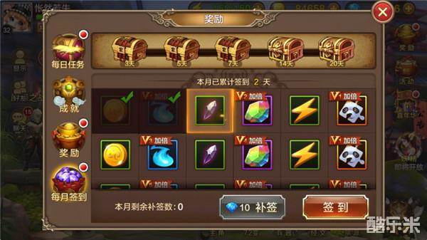 每月签到这个大家都比较了解,每天可以签到一次,并且领取当天的奖励物品,每天的奖励都不一样,这个在上图中我们也能一眼看出来。另外当我们每月签到次数累计到一定数量之后,可以额外领取上面的宝箱,宝箱中的奖励非常丰厚,在这里就不一一介绍了。如果前一天忘了签到,可以花费钻石来进行补签,但是对于这么喜欢这款游戏的玩家们来说,根本不可能每天不登陆的。