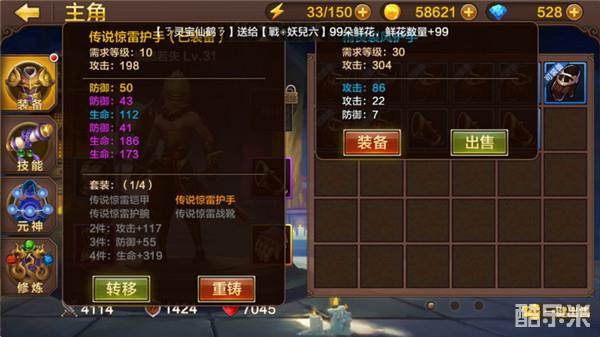当我们拥有了新的可佩带装备,并且新装备比现在携带的装备属性高的多的时候,点击新装备,在原有装备上会出现一个转移按钮,点击转移按钮之后可以将两件装备的附加属性调换,而基础属性不变。