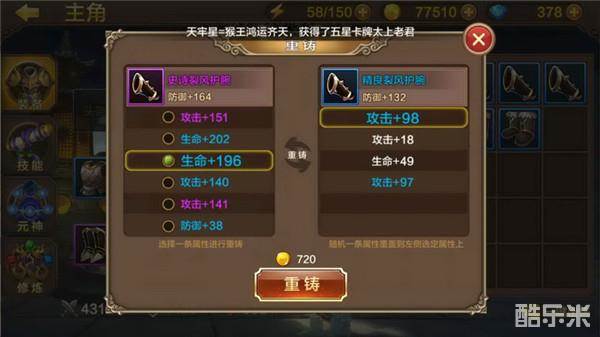 选择好要替换的属性之后,点击下面的重铸按钮,消耗一定数量的金币开始重铸。重铸时系统会在右边的装备附加属性中随机挑选一条,而非指定选择。