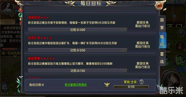 军衔是由军功点组成,目前获得军功点主要由野外杀敌、敌国任务、国战以及每日目标这四个途径组成。玩家在做刺探、挖矿等边境任务时,会遇到敌国玩家的干扰,杀死敌国玩家可以获得功勋值。在做敌国任务时,因为会进入到敌国境内,所以碰到敌国玩家也是在所难免,同样杀死敌国玩家可以获得功勋值,完成相应敌国任务,也能获得一定的功勋值。