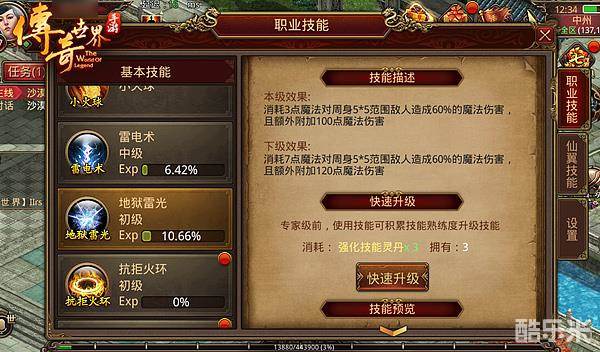 1.地狱雷光:消耗3点魔法对周围5*5范围造成60%的魔法伤害,且额外增加100点魔法伤害。