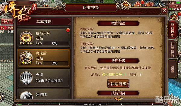 2.魔法盾:消耗7点魔法给自己增加一个魔法盾效果,持续120秒。可降低27%的物理与魔法伤害。