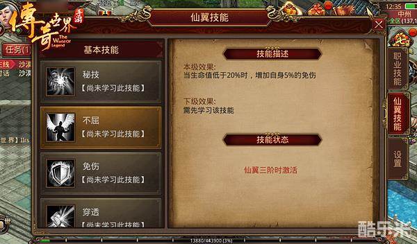 2.不屈:仙翼三阶时激活,当生命值低于20%时,增加自身5%的免伤。