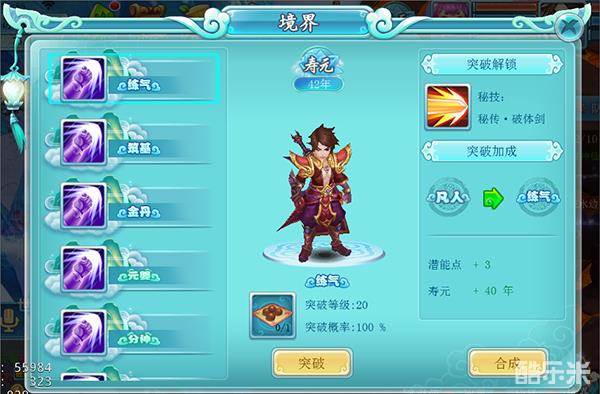 2.境界可以提高角色的寿元,潜能点,也会有秘技解锁。