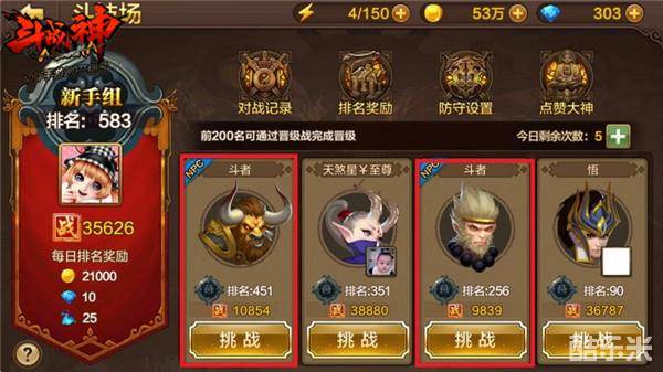 进入到斗技场之后,我们可以看到右边系统会自动提供4个可供我们挑战的角色,大家可以看到上图中用红框标注出来的两个角色左上角有个NPC的标示,也就说明他们是斗技场中的NPC,战力比较低,而且名字统一都是斗者。其他两个玩家角色有各自的昵称,并且战力都是该玩家的实际战力,挑战时我们可以自由选择。