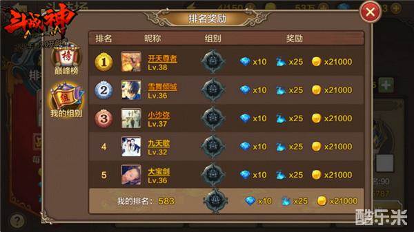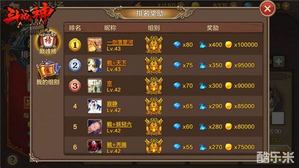 如果要查看排行榜与排行榜奖励,我们可以回到斗技场的主界面并且点击上方的“排名奖励”按钮。斗技场共有两个排行榜,巅峰榜是全区最高的组别的排行名单,如果你没在这里,那么就点击下面的“我的组别”产看当前组别排名与奖励。排行榜的奖励是每天发放一次,而且也是通过奖励系统的“奖励”功能发放,大家记得领取。