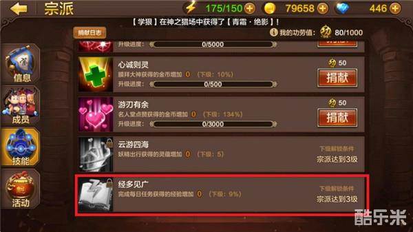 当宗派达到3级之后就可以学习宗派技能经多见广,一级的经多见广可以为每日任务增加9%的经验,等级越高增加经验越多,所以当宗派激活经多见广以后,大家可以优先捐献这个技能,非常不错。