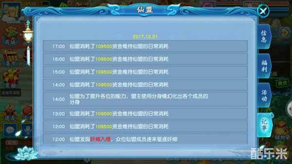 3、仙盟记事可查看盟会成员的捐献等情况。