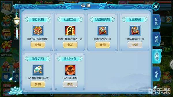 4、有仙盟活动:仙盟竞拍、挑战分身、仙盟之战、长生树、仙盟精英赛、仙盟奸细等。