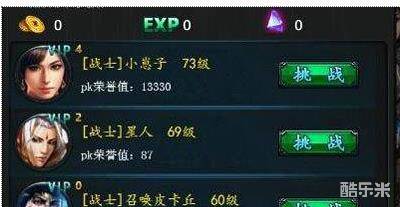遭遇到附近玩家时,可对其发起挑战。挑战胜利可获得荣誉值、经验和金币,有机率得到Boss挑战令。挑战胜利可赢得对方30%荣誉值,上限1000点。如果对方是红名,赢取的荣誉值翻倍。发起PK会获得红名值,PK值达到700点时,会成为红名。红名后PK失败会掉落10%金币给对手,红名值会随时间自动减少。每天100次PK后不再获得奖励。