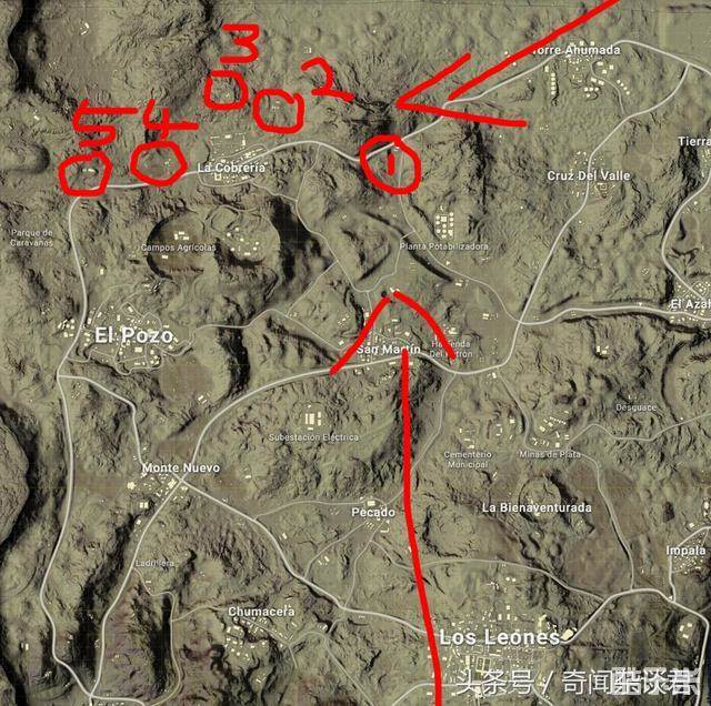 切记所有的打野路线都是围绕着烂尾楼和军火库并且安全的情况下才能在前期稳定的发育,如上图所示这条路线一共可以搜4个烂尾楼一个军火库(全游戏最肥的建筑),当开局飞机可以路过1号点的时候或者可以跳伞飞到一号点附近,在1号点沿线开始寻找车辆然后开车马上离开(不要纠结于一号点附近的野区资源因为时间就是生命啊)快速开车到2号点的烂尾楼搜装备,这时你已经有了一定的战斗力即使碰到敌人也有拼抢的能力了,3号点离2号点非常近开车直接过去搜3号点的烂尾楼快速离开直奔4号点,搜完4号点基本已经开始缩圈了这时候不要慌,第一波毒并不是很伤注意车辆的汽油是否充足。然后去5号点的军火库和烂尾楼,这里重点说5号点,以为到5号点的时候准备基本配齐了(运气好的话三级套不是问题),5号点有两个高级建筑都要搜,就是军火库和烂尾楼迅速搜完给自己打好药进圈,这条打野路线基本可以保证有充足装备和自身安全,唯一的劣势就是如果毒圈较远注意要有取舍不要太贪。