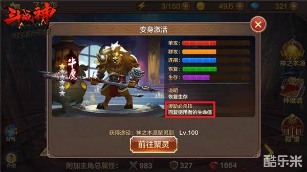关于援助必杀技的话,首推牛魔必杀,并且将这个技能放在第一个释放位置上。因为当牛魔达到3星之后,它的援助必杀技会带有回复生命值的特效。而且就算没有达到3星,牛魔援助必杀技的攻击范围也比较大,并且释放动作简单迅速,可以让对方来不及躲闪。不过要激活牛魔,首先需要将神之本源升至100级,所以还需要一点时间来培养。至于另外两个必杀技的位置,可以选择带有增加防御的必杀技,或者使用打击频率高的,这样可以更迅速的打破对方的霸体,以达到更有效的输出。