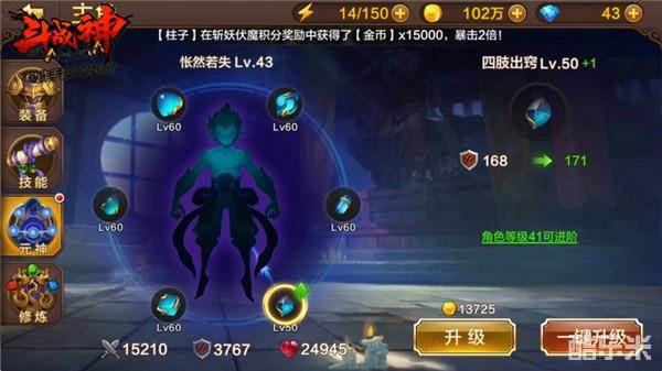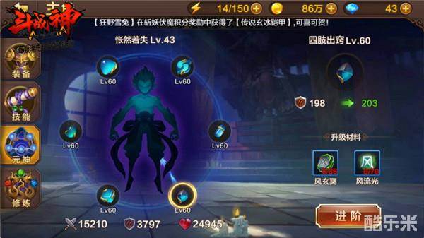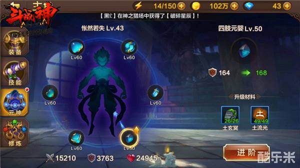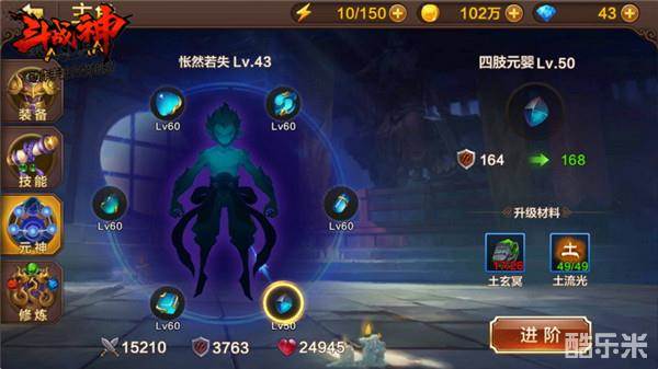 拥有了足够多的进阶材料之后,我们就可以点击进阶按钮直接突破当前的等级了,突破之后当前元神就需要继续升级,以达下个整十级,然后再收集材料,再次进阶。