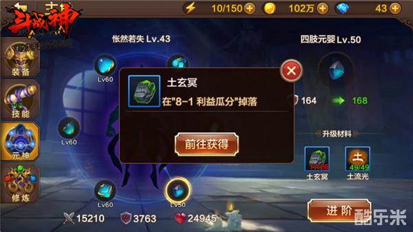 元神是主角四种基本功能中的一个,所以我们要想找到元神,就必须打开主角的界面。元神一共分为6个部位增加三项基本属性,我们以角色形象为分界线,左边的三个元神都是增加两种属性,但是增幅较小。右边三个元神都是增加一种属性,增幅较大。元神每升至整10级的时候就需要进阶一次,进阶需要两种升级材料,大家从上图中也可以看到。这两种材料在哪获得呢?我们点击一下现在缺少的土玄冥来看看: