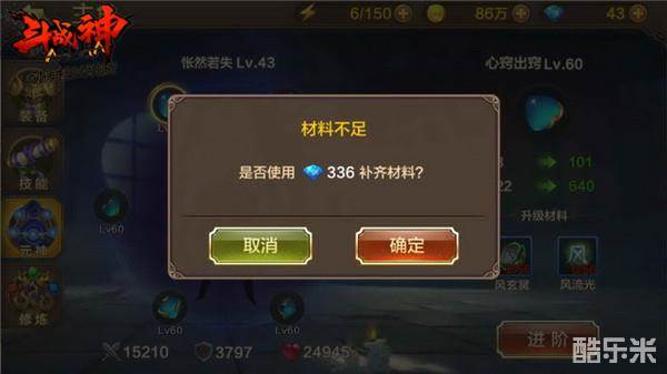 如果当前所需的进阶材料我们没有办法通过关卡获得的话,可以直接点击进阶按钮强行进阶,花费一定数量的钻石之后系统将补齐进阶所需的所有材料。所以说,如果你是一个土豪玩家的话,完全可以忽略因为等级不够而无法进入下一章节来获取进阶材料。并且随着元神的等级越来越高,升级所需的金币费用也会变的让人无法小视。所以在元神这个系统中,平民有平民的道路,土豪有土豪的玩法,战力的差距就是这么一点一点体现出来的。