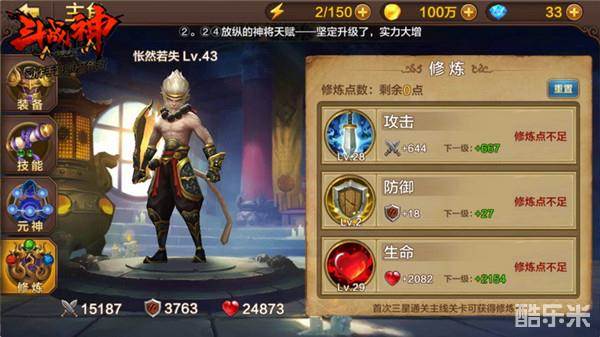 前面也说了,修炼是主角专有的一种功能,所以要想找到修炼界面,就得打开主角的角色界面。从上图中我们可以看到,修炼可以增加角色的三种基本属性,攻击、防御和生命。每种属性都可以使用修炼点进行升级,级别越高增加的属性就越多。在修炼栏下方有一行系统提示的小字,显示首次三星通关主线关卡可获得修炼点,现在就给大家具体展示一下。