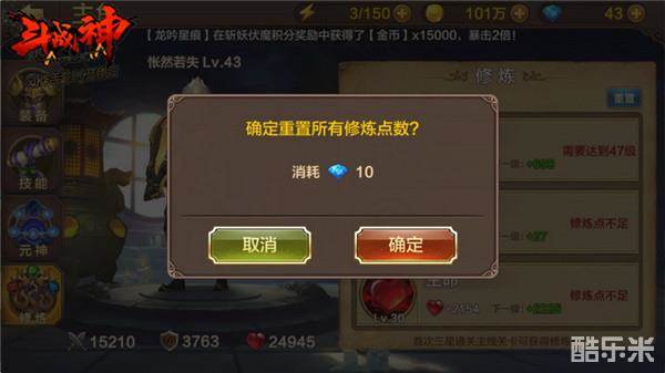 点击修炼界面右上角的重置按钮,我们就可以重置当前所有修炼点。重置功能在角色未达到40级之前是免费使用的,而且不限制次数。40级之后每次重置就是消耗一定数量的钻石,但是收费很少,甚至可以忽略不计,非常亲民。