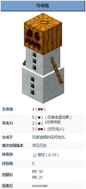 最后编辑于7年前雪傀儡(Snow Golem)是一种可以帮助抵御敌对生物的效用型生物。