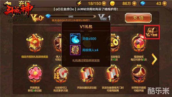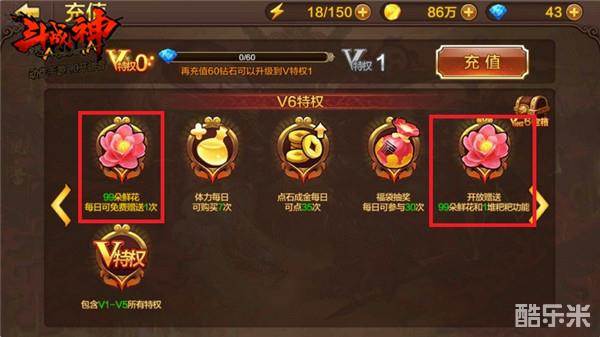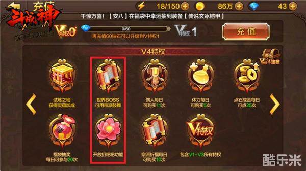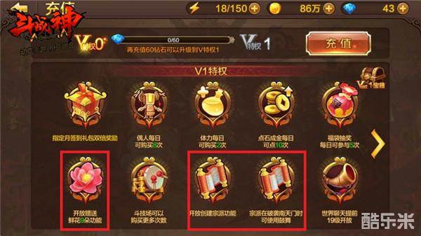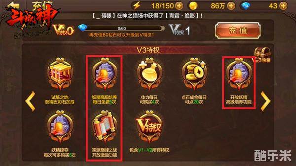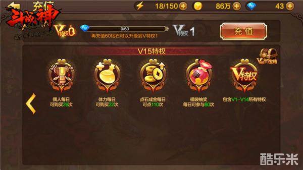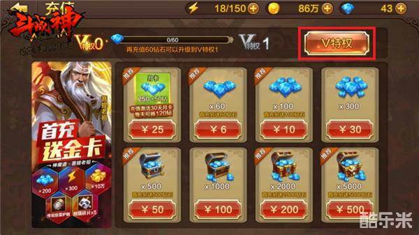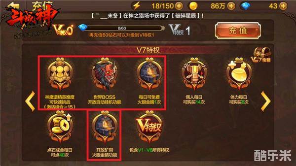 斗战神中的充值数额现在已经跟大部分游戏一样了,起步价是6块,完成首冲以后可以获得首冲奖励,奖励的内容还是比较丰厚的,尤其是对于新手玩家来说,赠送一件传说装备可以让我们在游戏前期难度减少一点。而且从上图中我们也可以看到,在有些充值数量上有首冲的双倍奖励,最高的是冲500送500。充值钻石的同时可以获得VIP特权的经验奖励,只要充值达到一定数量之后,就可以提升VIP特权等级。我们来看看VIP特权都有什么特别重要的功能吧,点击上图中标注的位置就可以打开V特权功能界面,一起来看看。