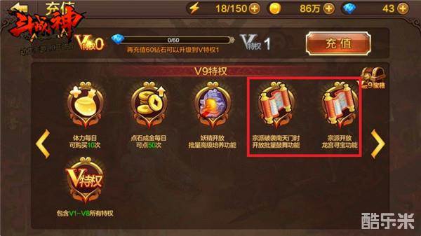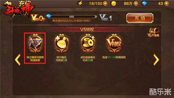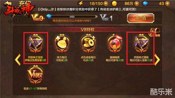 V8玩家可以进入神之宝库,并且每日免费探索3次。神之宝库中掉落的物品与神之猎场一样,主要产出兵器和经文,但是奖励更加丰富,所以开启V8的玩家每天要记得探索3次神之宝库,以免浪费。