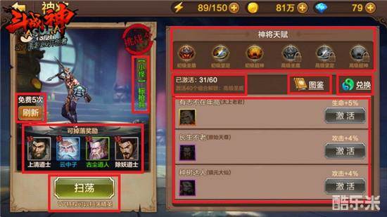 我们就以所有玩家都有的神将变身为例说明,点击神将的神魔谱之后就会进入到上图的界面中。从上图中大家可以看到全是小编标记的红框,看的是否眼花缭乱?其实内容倒是很简单,我们一个一个来说。神魔谱是专为变身激活天赋而设定的,而且激活变身的天赋只能通过这一种办法。既然我们选择的是神将的神魔谱,那这里肯定就是为了激活神将天赋用的,所以右边的信息显示了神将天赋、已激活数量和激活下个天赋所需的激活数量。如果当前所有的60个图谱组合都被激活,就可以激活所有神将天赋。下面会显示各种激活组合所需的图谱,这些图谱就需要我们挑战左边的挑战令获得。挑战令的怪物分为三个档次,从低至高依次为绿色的“小怪”、蓝色的“精英”和橙色的“首领”,小怪最高掉落蓝色图谱,精英最高掉落紫色图谱,首领最高掉落橙色图谱。如果玩家已经激活15个组合以上,普通玩家可以直接扫荡绿色的小怪,V7特权可以扫荡精英。每天系统会赠送玩家5次免费刷新的机会,用完之后每次刷新需要消耗5钻石。