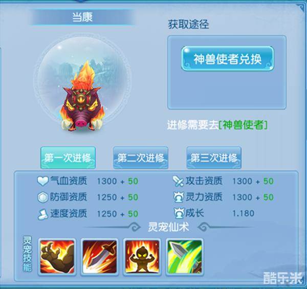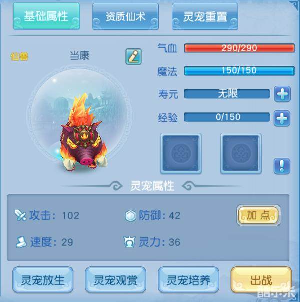 跟普通灵宠一样都是使用迅宠果和灵兽丹培养,但重置当康消耗的是仙兽魂晶,重置后改变当康的技能跟资质。此外当康还能进行3次进修,根据当康等级依次解锁,进修后获得更高属性。