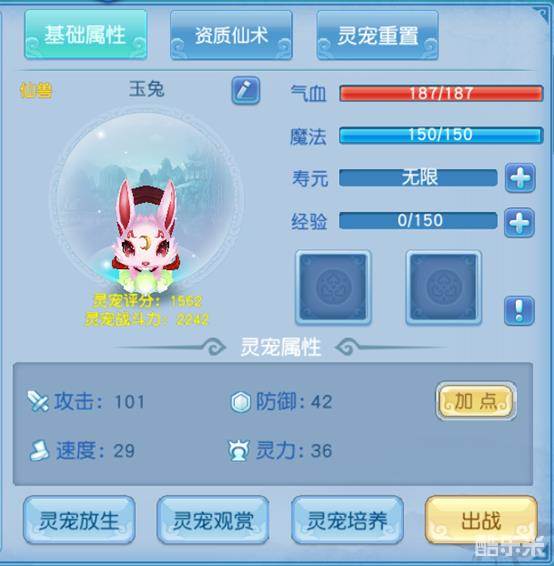 玉兔拥有自己的等级、气血、魔法、攻击、防御、速度等。其基础属性、技能、仙术资质都比普通灵宠的高。除了普通技能栏外,玉兔还能额外领悟一个特殊仙术“激怒”。