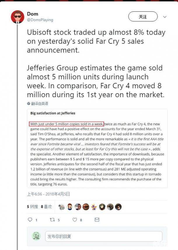 然而根据国外公司Jefferies Group分析师发布的一篇报告,《孤岛惊魂5》首周销量大约在500万套左右。对比而言,《孤岛惊魂4》发售一整年后销量才800万套,这一对比可以反映出《孤岛惊魂5》的表现是有多么惊人,年内突破1000万应该不成问题。
