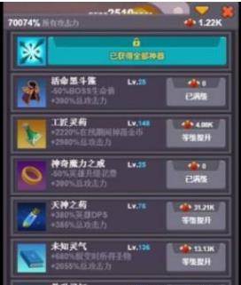 神器可以分成三类,金币加成类、点击加成类还有鸡肋类。