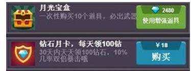 商城里头,最推荐的东西就是月光宝盒了,运气好的话,可以抽到3~7个武器,运气不好也有一些道具,就是那些你得花钻石买的天降黄金、自动点击、等等。