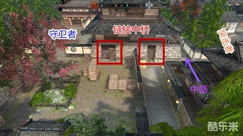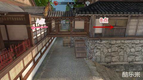 首先介绍的是B点的一些防守位置,如图所示守卫者的复活点和突击者的复活点离的位置不是很远,中间的两扇门是链接中桥的门可以从中桥来防守B点,可以选择走前面的门偷袭敌人也可以走后门的门蹲B点守着,走前面的门可以直接走到突击者的复活点且往左走就是小树林也就是这张地图的中路位置,竹町阁这幅图的中路还有一个小木桥可以选择对狙还是很不错的选择,守卫者守B点也是十分轻松的只需蹲在链接中桥的小房子里就可以轻松守住,或者在B包点箱子后门守着主要就是听敌人的脚步声其次就是自己的反应能力和意识能力了,且B点的角落轮子那里也就是图中红方框中间的位置有一个圆形的窗口可以让狙击手来守着就更轻松的守住B包点。