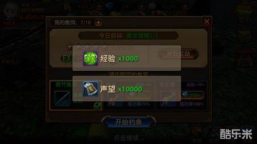 第二,是到主城广场中参加钓鱼活动。在钓鱼玩法中,每日都有不同的目标,比如一定数量的三色锦鲤、黄金锦鲤等等,达成目标即可获得经验与声望奖励!主公也可使用钻石来提升任务的星级,最高可提升至5星,完成任务后可获得1万的声望奖励!