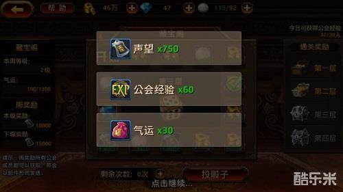 第四,是参加藏宝阁的掷骰子活动。主公在加入公会后,每日都可在公会藏宝阁参与掷骰子活动,每走入一个格子中都有机会获得体力、声望、钻石等奖励,每走完一层还可领取额外的通关奖励!此外每周所有公会成员都可领取一份海量的声望作为周奖励!