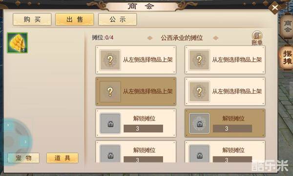 3.摊位:默认四个出售摊位,可用元宝解锁更多摊位。