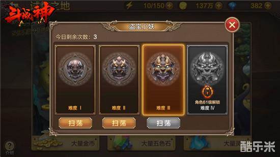 每个关卡都有4种难度,角色等级越高,可挑战的难度就越大。每个难度都有物品的掉落上限,难度越高上限就越大,比如盗宝小妖的难度1最多掉落2W金币,而难度2就是5W,以此类推,其他两个关卡也是这样。当我们顺利通关某个关卡的某个难度之后,就可以免费使用该难度关卡的扫荡功能,节省我们的挑战时间。如果没有通关也无需担心,系统会根据我们的进度来发放奖励,奖励是不会少给的。