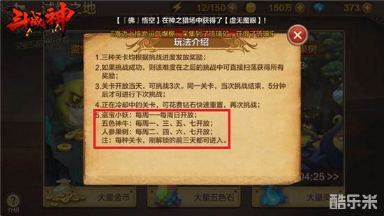 试炼之地的这三个关卡并不一定每天都会全部开放,除了盗宝小妖是每天开放之外,五色神牛是每周一、三、五、七开放,而人参果树是每周二、四、六、七开放。另外每种关卡刚解锁的前三天都可进入,过了三天之后,开放时间按照上面介绍的那样进行。