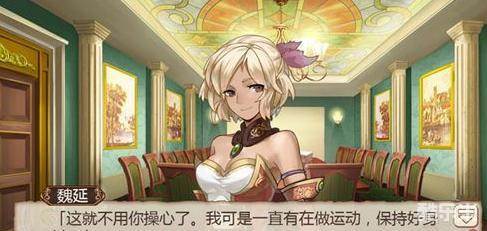 某天,魏延和艾斯一起在议会厅内处理公务,由于魏延中途睡着很久,艾斯吐槽,这样下去肯定会变成一个大胖子。魏延回答道:这就不用你操心了。我可是一直都有在做运动,保持好身材。
