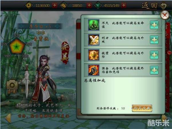 侠客达到青霄位后,会开启全新的潜能系统!通过消耗该侠客的精魄和其他升级材料,可以提升当前侠客的某一具体属性喔!