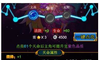 在这个页面里,玩家可以使用星星来点亮主角的天命星辰,每一次点亮都会带来属性提升,而在点亮的天命数量达到一定的程度后,就可以将主角的品质提升为紫色了哦。