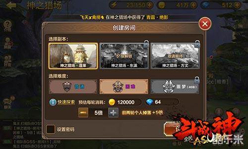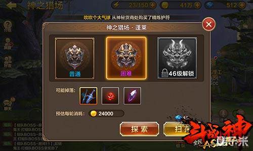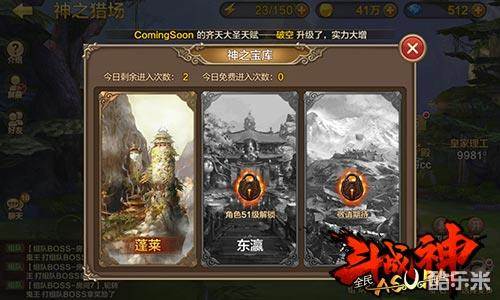 神之宝库并不是重点,重点的是神之猎场,神之猎场分为两种,一个个人模式,另一个是组队模式,组队模式获取的东西更好些,但是难度也会更高,玩家需要更多战力才能挑战,两种模式都是有3个场景蓬莱、东瀛、方丈,蓬莱解锁既可以挑战,东瀛需要到51级,现在方丈还没有开放。东瀛和蓬莱获得神器不同,东瀛的神器品质会高些,一样难度也会提高很多。