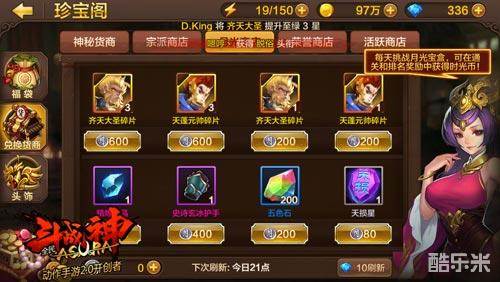 活跃商店中出售的都是和72变有关的道具,我们能够买到神将、修罗、罗刹、牛魔、齐天大圣的碎片,还可以购买到齐天大圣和天蓬元帅的初级天赋书。