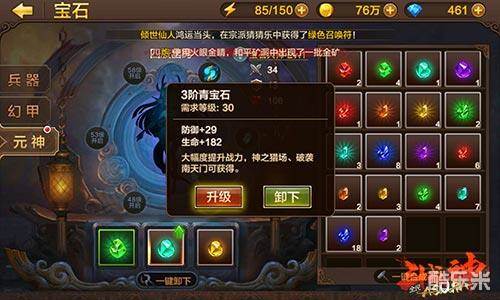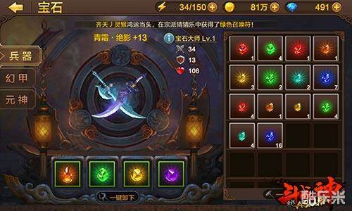 宝石镶嵌后只要低等级的宝石足够多,就可以一键升级,不需要一级一级的点了。兵器的宝石槽是需要的钻石的,但是兵器被销毁后会返还这60钻石。还是很划算的。