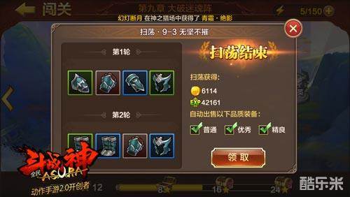 在闯关系统中,除了精英关卡以外都有概率掉落传说装备,不过掉落的概率相对较低,大家可以通过偶人扫荡提高传说装备的掉落概率。