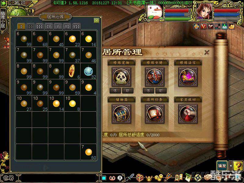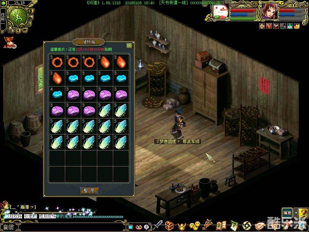2. 怪物材料63种全部放在城内房子仓库里,为什么放在房子里呢?因为每次遁回师门就消耗一定的蓝和血,总体来讲,要怪材的频率还是挺高的,而在总管要怪材的时候,直接小八卦飞回房子,然后血和蓝就自动满了,像小编一天做400个任务,遁回师门的次数差不多100多回吧,其间消耗的蓝和血药就相当大,这样以要怪材的频率,几乎就用不着我们自己回蓝回血了,节省了大量药钱。