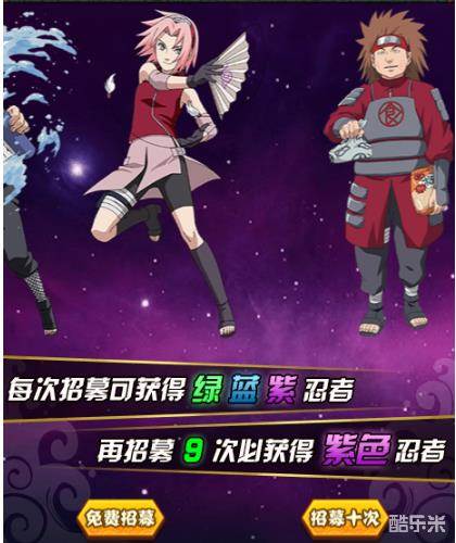 这里是招募界面,大部分的角色就是从这里产出,每天免费招募最多有8次。每隔一段时间恢复一次。每招募10次稳定获得一个紫色忍者,十连的话也是一样稳定获得一个。