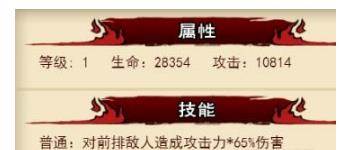普通技能,对前排敌人造成攻击力x65%的伤害。