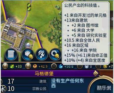 把鼠标移动到城市的科技值产出上,可以看到科技值主要受相邻区域,自带建筑(图书馆,大学),人口数,政策,宜居度影响