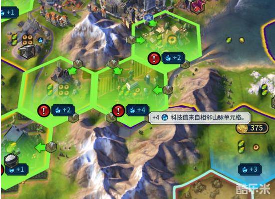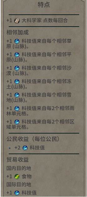我们主要看相邻加成,就是山脉,雨林,区域单元格。什么意思呢?就是说只要你的学院附近山多,雨林多,再被包围起来,那么学院基础产出的科技值就更高!越利于科技升级!