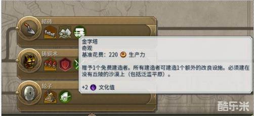 继续!首都周围有沙漠的话,第一时间科技可以点出金字塔。然后建造者就能多挖一片森林了,这个玩意越早建越好,可以省下政策的建设者加强,非常的划算呀~