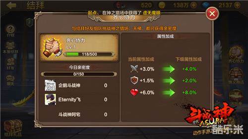 攻击+3%、防御+2%、血量+8%,升级后三种属性分别有1%、0.5%、2%的固定成长。我们通过叫上结拜的兄弟参与神之猎场和天梯都能获得亲密度。当然每天上限增加150点,这里推荐每天刷满百分比增加属性是终身受益的。